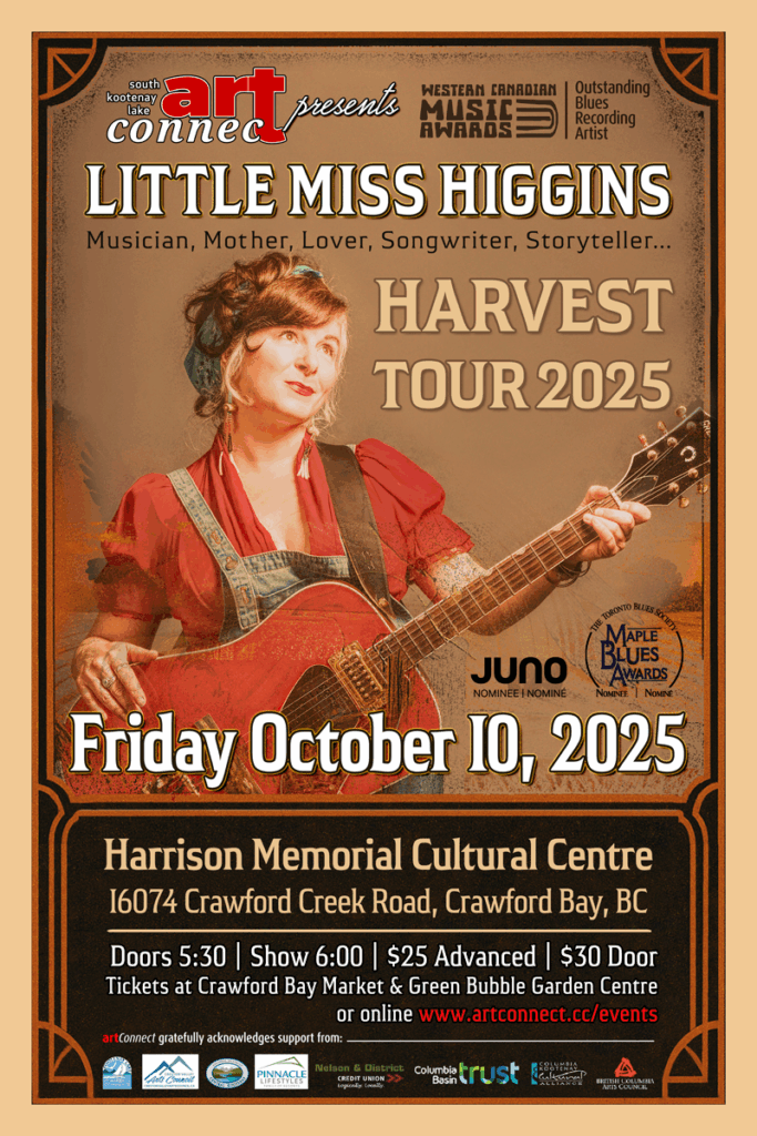 For Crawford Bay’s 4th Coffee House on June 25th, ArtConnect presented a stellar encore performance from Kaslo’s treasured singer-songwriter, harper and poet, Diemm. Music’s power to align and illuminate was in full bloom, as Diemm laced her profound poetry into her riveting harp compositions. Thoughtful prose delivered in deft, dramatic layers. Thank you, Diemm for an exceptional evening that we’ll remember fondly …
